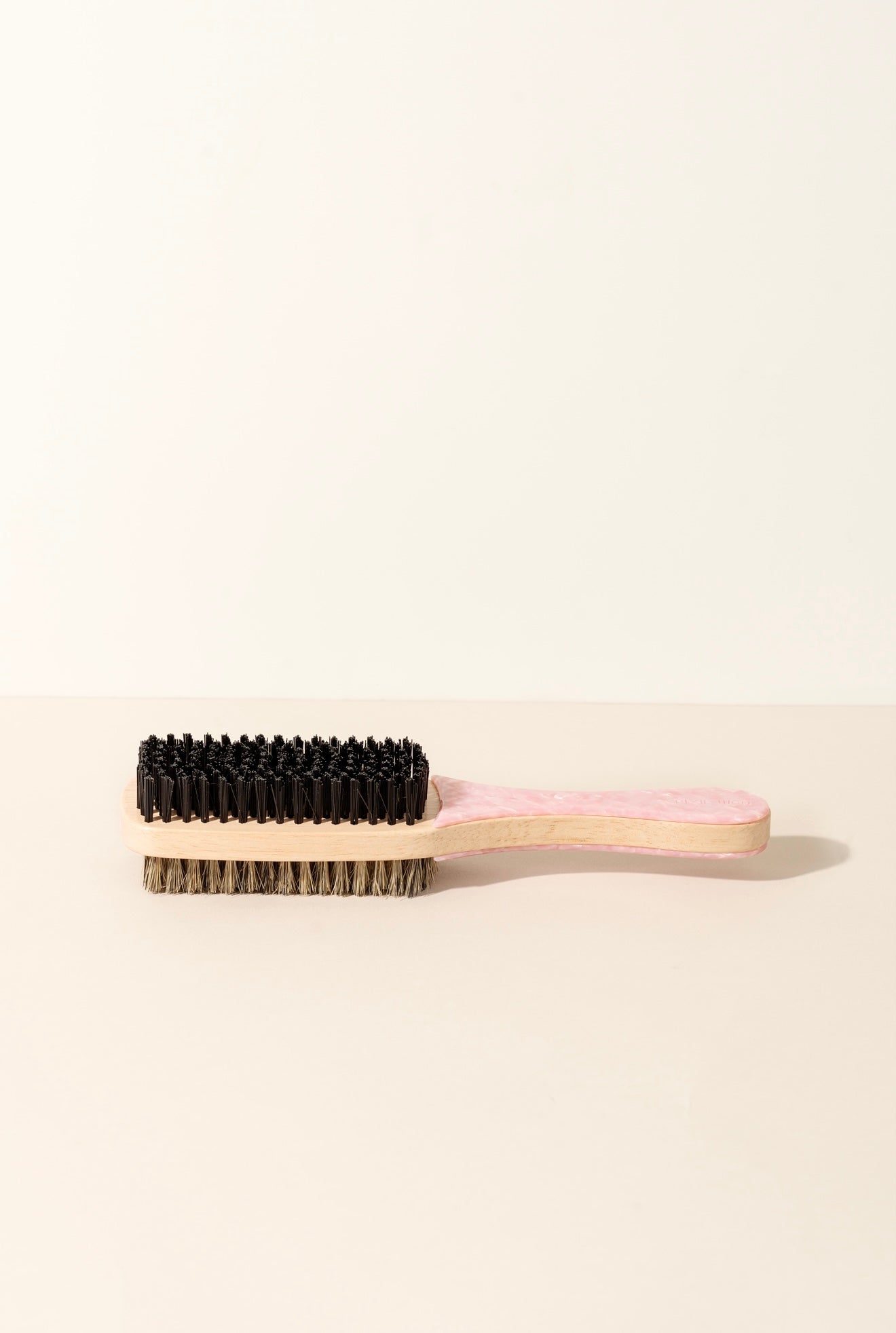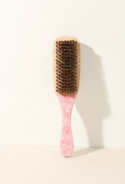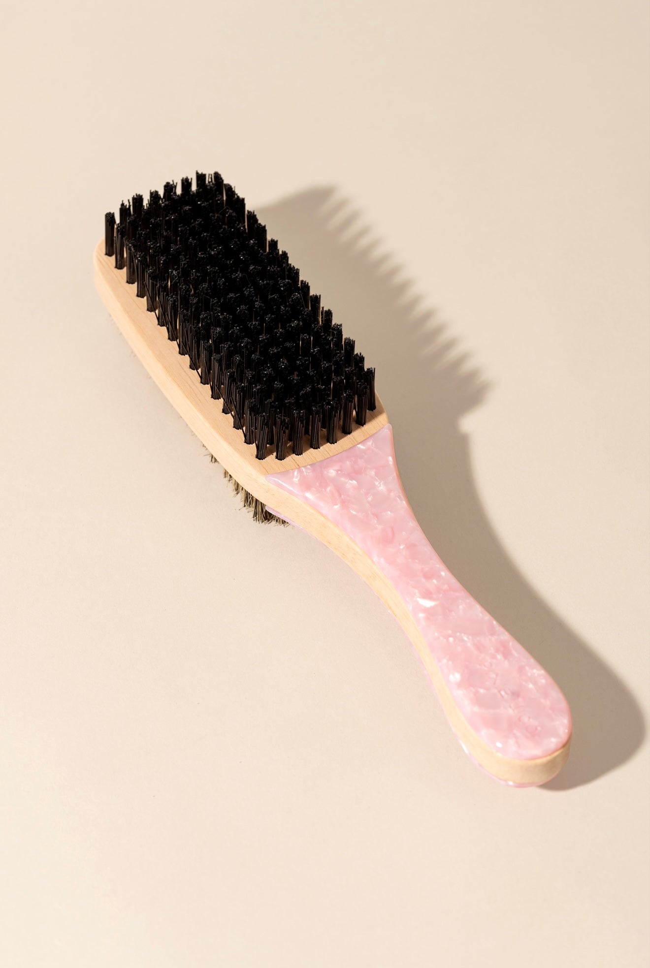 Achieve the perfect sleek-back look with this eco-friendly double-sided brush, crafted from sustainable bamboo. One side features firm boar bristles to smooth flyaways and evenly distribute natural oils for a polished, frizz-free finish. The other side offers precision control with a fine-tooth comb, ideal for parting, shaping baby hairs, and detailing edges. Lightweight, durable, and gentle on the scalp, this brush is your go-to for effortless styling with a natural touch.